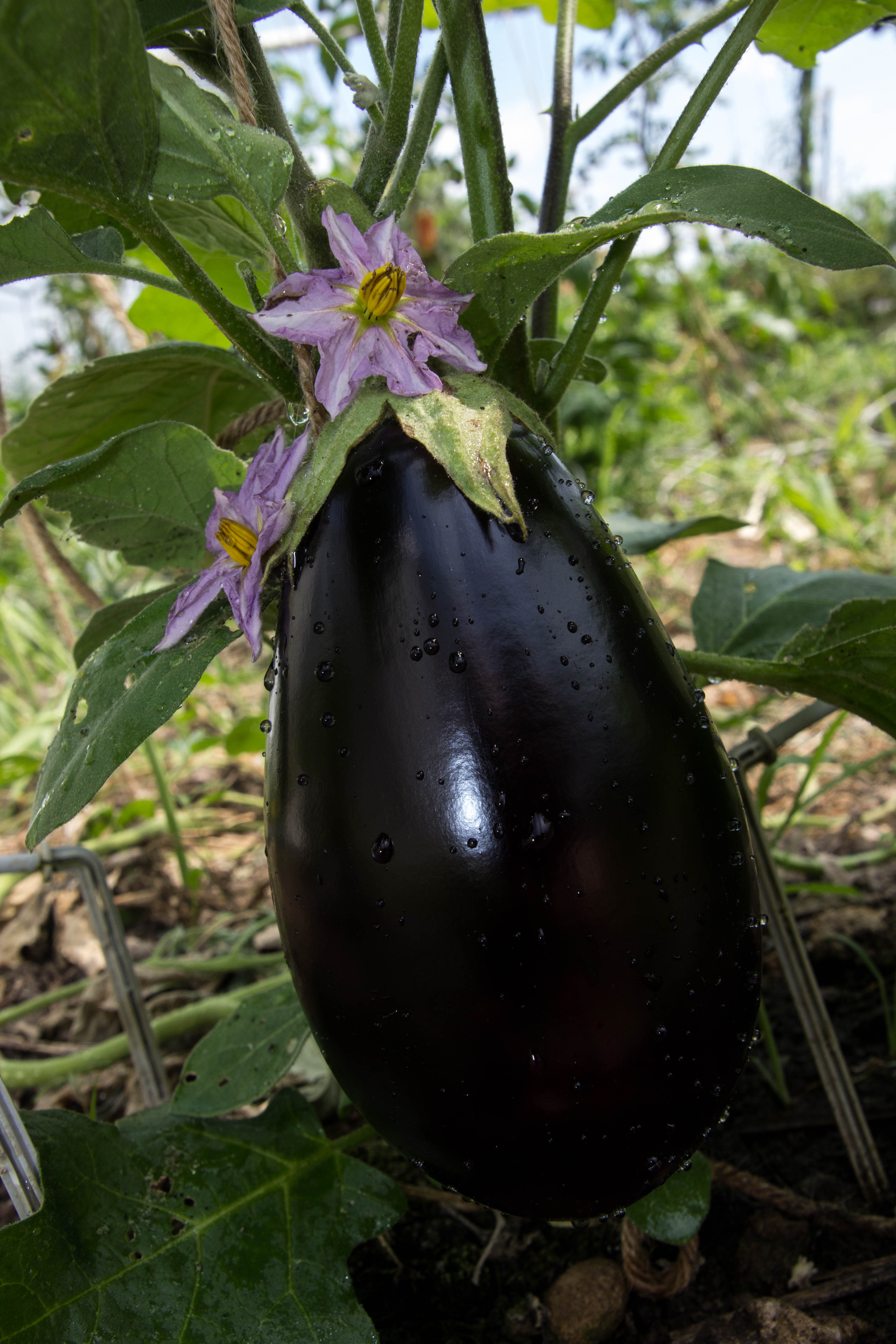 Aubergine violette. Se consomme en grillade ou sous forme de caviar d'aubergine. Disponible de juillet à octobre